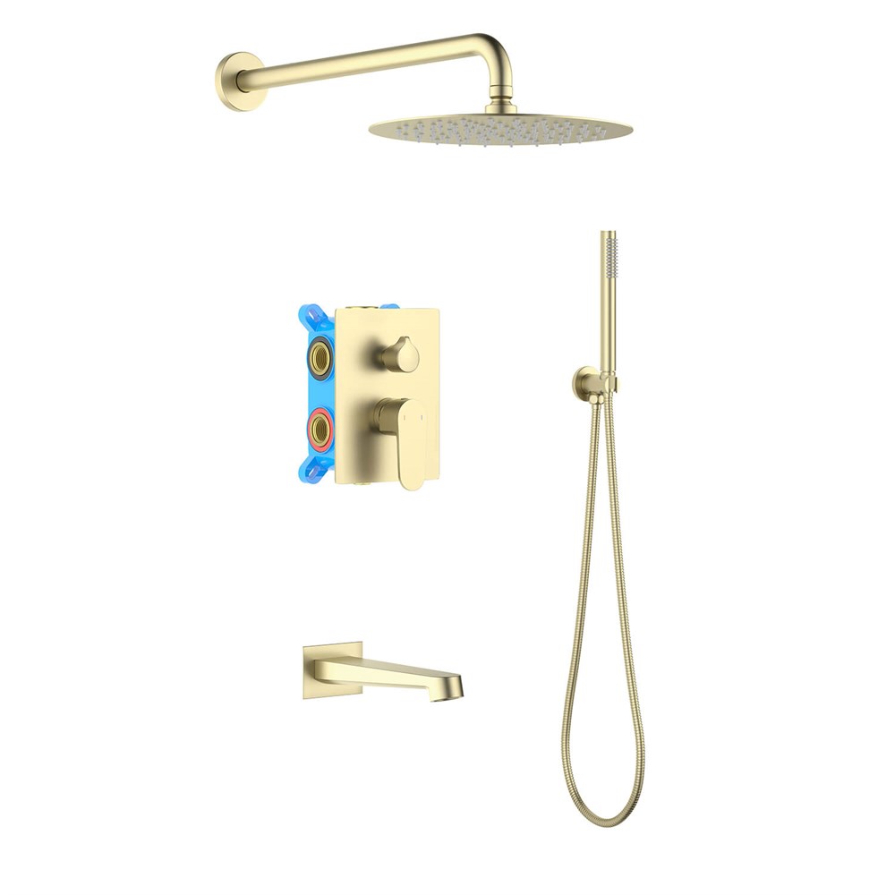 смеситель из латуни на 3 потребителя с установочной коробкой; картридж citec 35 мм, испания; декоративная пластина 3мм из нерж.; дивертор - керамический картридж; кронштейн для верхнего душа 400мм из нерж.; верхний душ 250х2мм из нерж.; латунный держатель ручного душа; ручной душ из латуни на 1 режим струи; душевой шланг 1,5м из нерж.; латунный излив с аэратором neoperl; упакован в коробку, пленку из вспененного пвх