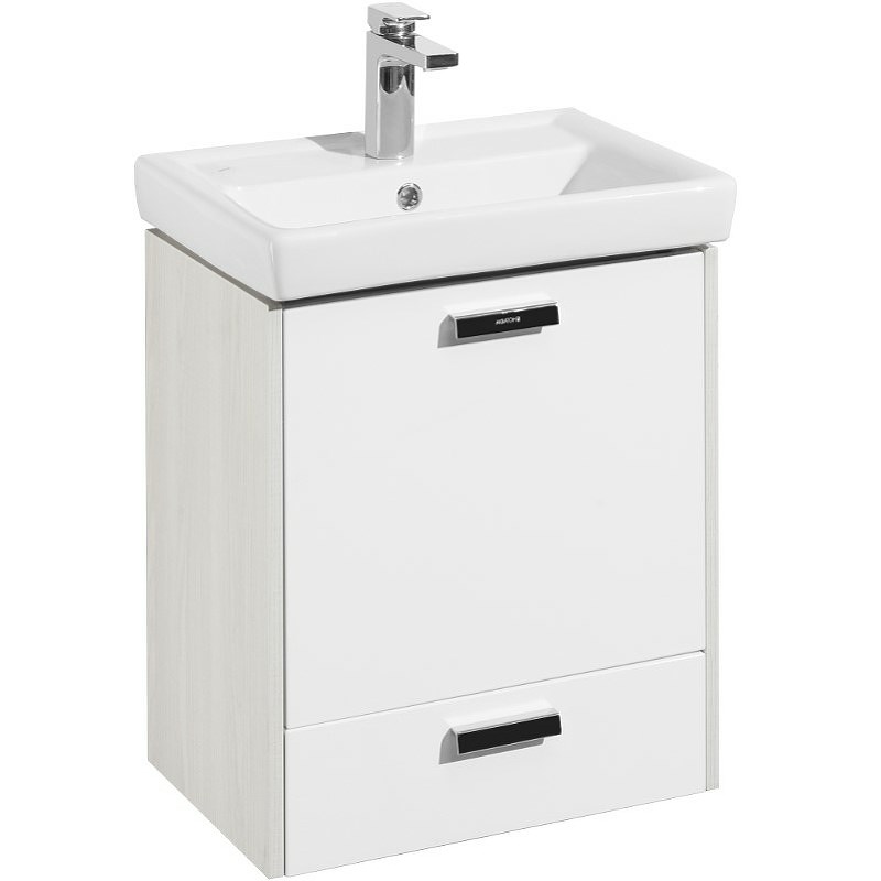 Тумба под раковину Йорк 55 М от AQUATON - практичное и функциональное решение для ванных комнат в современном стиле. Несомненные достоинства данной модели - простой удобный дизайн и компактные размеры. Разместить все необходимое позволит верхнее отделение, скрытое за распашной дверцей, и нижний выдвижной ящик с системой плавного закрывания. Корпус, изготовленный из влагостойкой ЛДСП с древесным декором под ясень, гармонично сочетается с белоснежным фасадом из МДФ, покрытым полиэфирной глянцевой краской ультрафиолетового отверждения. Оптимальная система хранения, петли с доводчиками и оригинальная фурнитура европейских производителей делают эту модель идеальным решением для небольшой ванной комнаты.