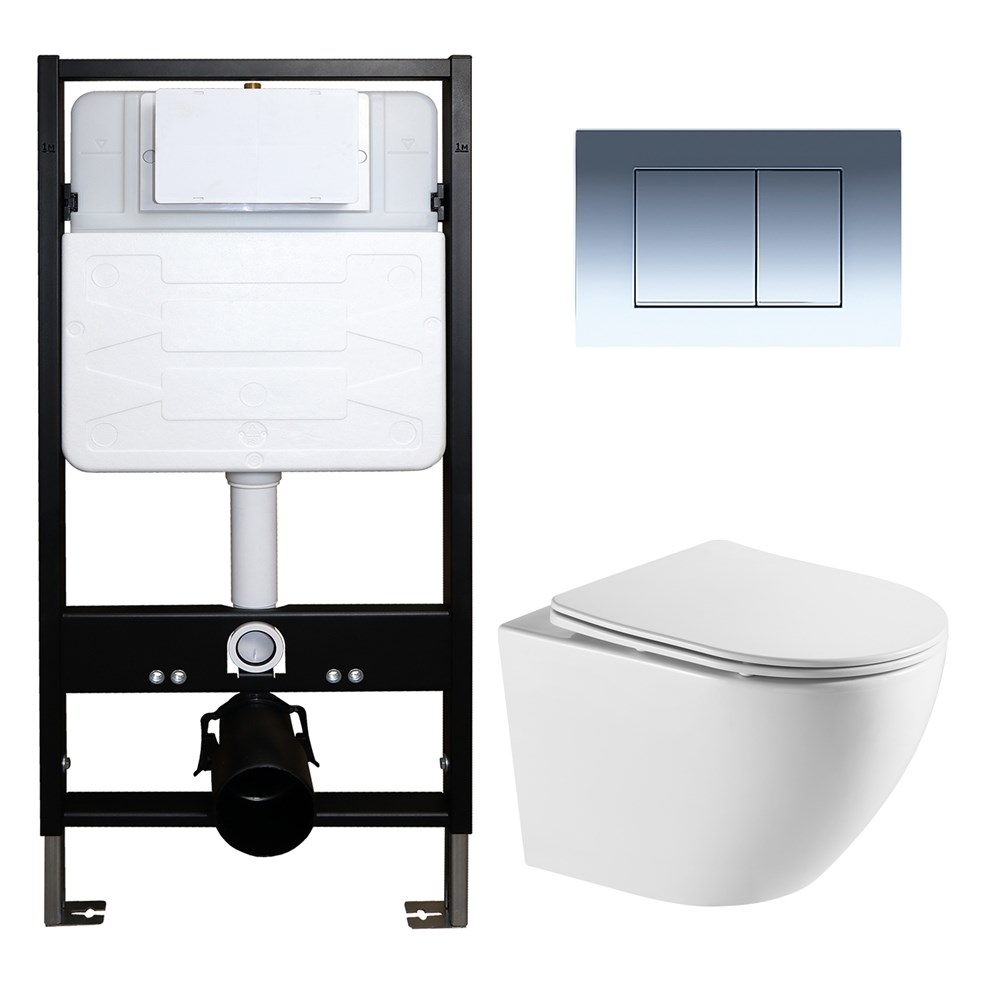 AZARIO Сет: Инсталляция для подвесного унитаза AZARIO FORTE + подвесной унитаз Azario Grado безободковый, слив "скрытое Торнадо + Кнопка смыва AZARIO FORTE хром глянцевый (AZ-100-100F+AZ-0046-UQ3+AZ-100-002F)