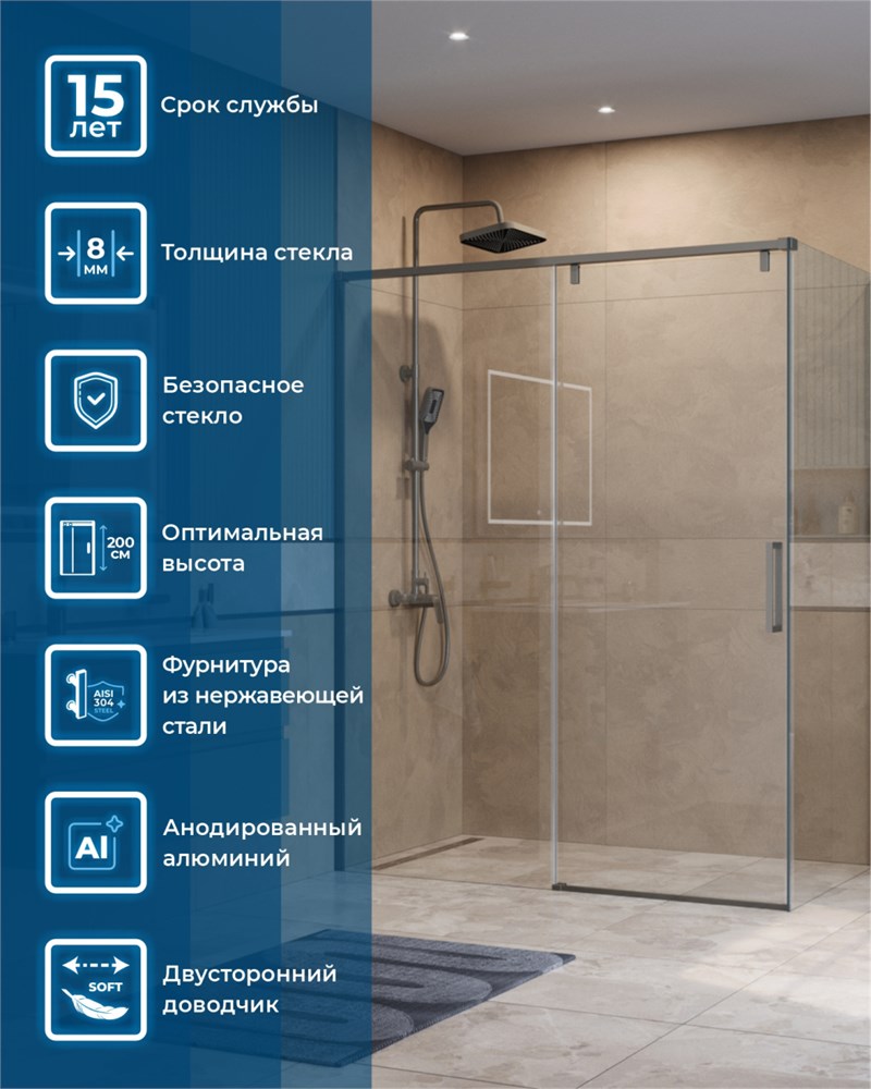 BELBAGNO Soft Close-1 Душевой уголок прямоугольный размер 150x100 см профиль - оружейная сталь / стекло - прозрачное, двери раздвижные