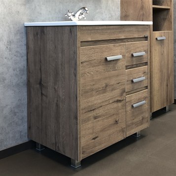 Напольная тумба-умывальник с одной створкой и тремя ящиками. Створка оснащена системой плавного закрывания. За створкой одна горизонтальная полка.