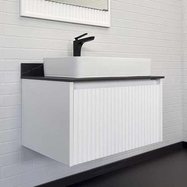 Фасад тумбы из МДФ фрезерован геометрическим узором с имитацией волны и окрашен белой матовой эмалью.