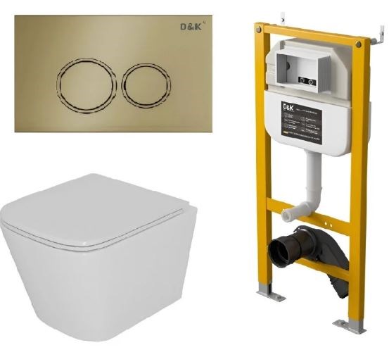 DK Комплект Унитаз подвесной безободковый D&K Berlin DT1436016+Инсталляция рамная скрытого монтажа D&K DI8050127, 500*117*1270мм, для подвесного унитаза+Клавиша смыва D&K Bayern DB1529007, матовое золото