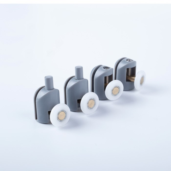 Комплект роликов для раздвижных дверей душевой кабины или ограждения. Подходят для стекол толщиной 5-6 мм. Комплект из 4 штук (2 верхних и 2 нижних ролика). Нейтральный серый цвет.