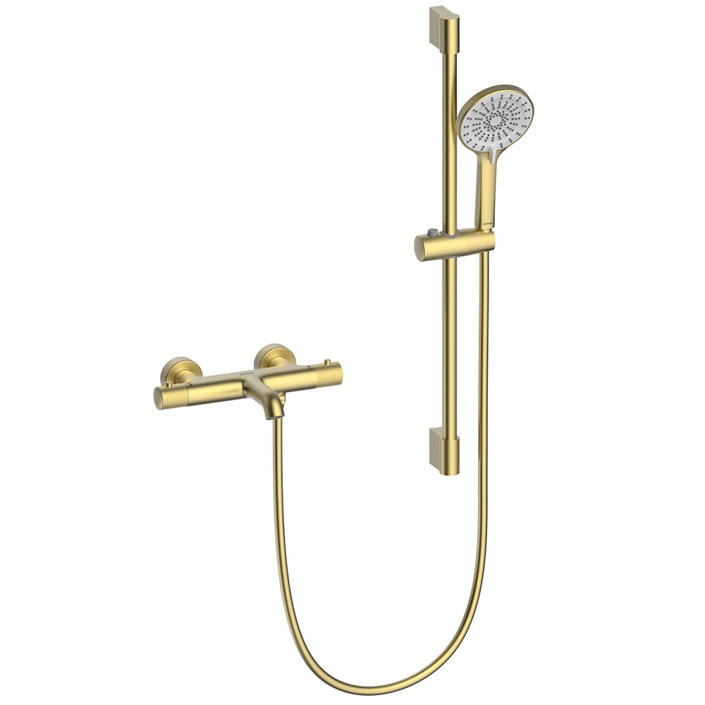 КомплектацияКорпус смесителя с монолитным изливом с аэратором, термостатическим картриджем, 3-позиционным картриджным переключателем с керамическими пластинами и металлическими рукоятками, стойка для душа, держатель душевой лейки, 3-функциональная душевая лейка, душевой шланг 1,5 м, присоединительная группа для настенного крепления
