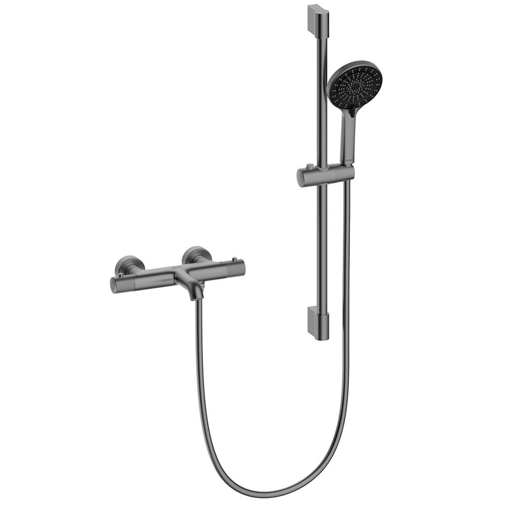 КомплектацияКорпус смесителя с монолитным изливом с аэратором, термостатическим картриджем, 3-позиционным картриджным переключателем с керамическими пластинами и металлическими рукоятками, стойка для душа, держатель душевой лейки, 3-функциональная душевая лейка, душевой шланг 1,5 м, присоединительная группа для настенного крепления