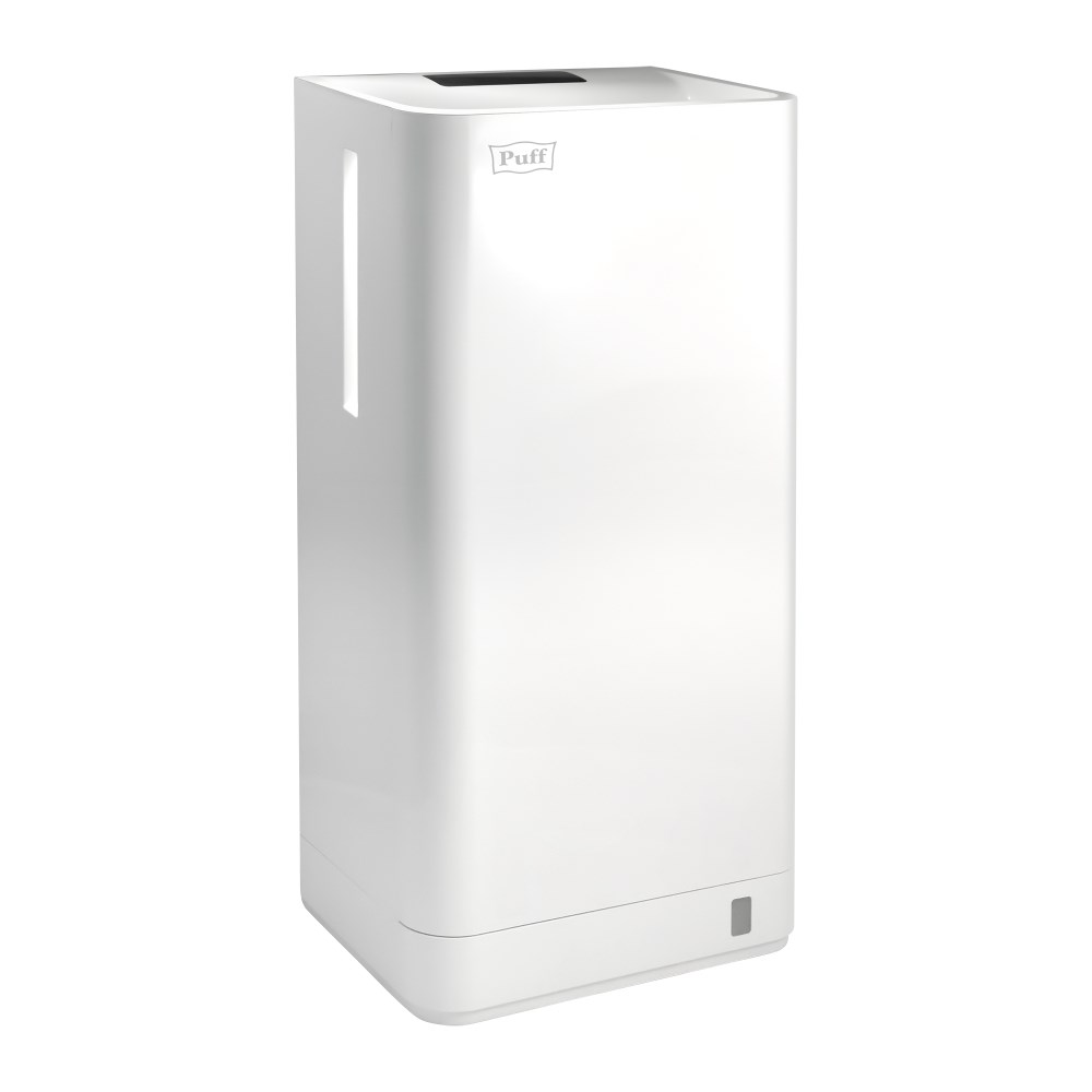Электросушитель для рук Puff-8875, погружной, 1,8 кВт, относится к классу высокоскоростных электросушилок с вертикальной загрузкой рук во влагоприемник. Осушение рук осуществляется за счет двух узконаправленных быстрых потоков воздуха, которые фактически сдувают воду. Скорость воздуха может достигать 95 м.сек. При использовании такого типа электрополотенца, сушка рук занимает от 5 до 7 секунд. Данная модель рукосушителя снабжена переключателем холодный-горячий, что дает возможность использовать холодный воздух (при мощности устройства 1200 Вт.) или горячий воздух (при мощности устройства в 1800 Вт.).